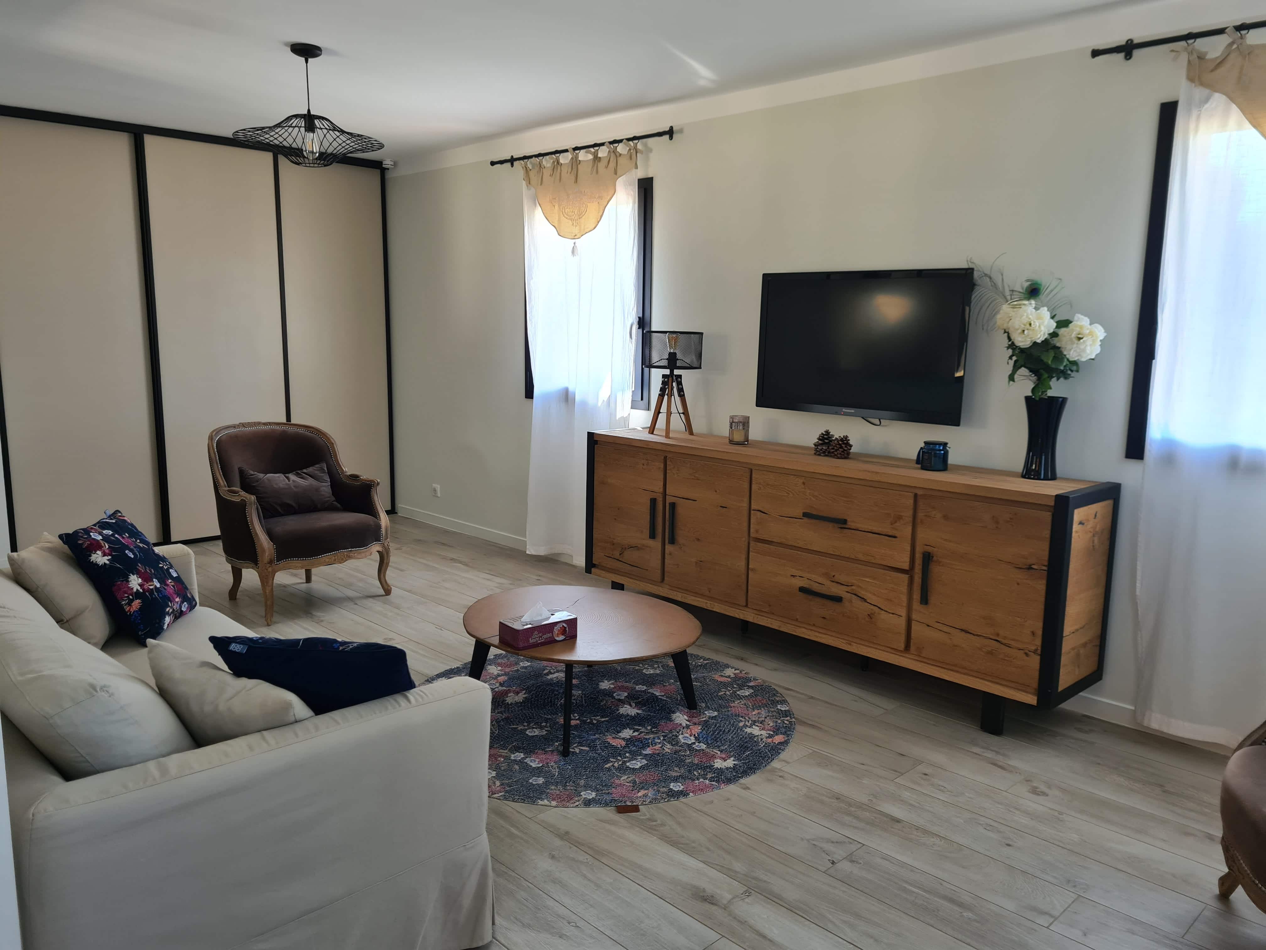 – Salon avec canapé convertible 140x190cm déplié (possibilité de 2 couchages d’appoint supplémentaires), 2 fauteuils, buffet, TV écran plat connectée avec chaînes de la box Orange, lecteur DVD blu-ray, console de jeux Playstation 4, climatisation réversible, placard de rangement avec sèche-linge et ustensiles de ménage.